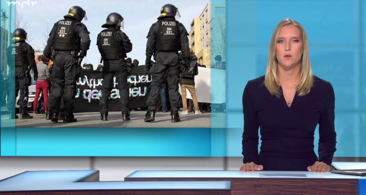 Am Samstag strahlte er in der Sendung „Sachsenspiegel“ einen Beitrag über die Ereignisse des Tages aus. Auf einem Foto, das als Moderationshintersetzer genutzt wurde, waren antifaschistische Demonstranten mit einem schwarzen und einem weißen Transparent zu sehen, vor ihnen eine Reihe Polizisten.