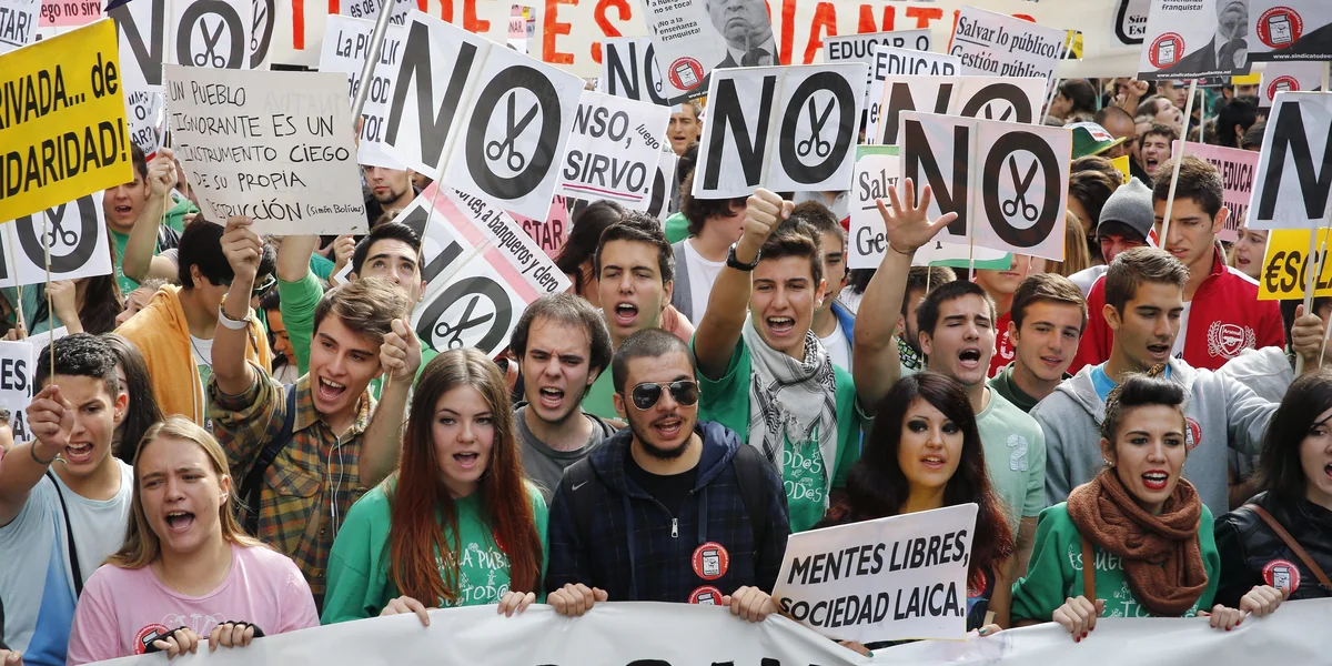Seither wird bei den staatlichen Schulen noch stärker gekürzt, während die privaten in Ruhe gelassen werden. Im Vergleich zu 2009 hatten die öffentlichen Schulen 2015 nur noch 86,77 Prozent der Gelder, während die staatlich finanzierten Privatschulen 100,46 Prozent verbuchten und damit trotz Milliardenkürzungen im Bildungsbereich sogar noch zulegten. Spanien gibt insgesamt 4,2 Prozent seines Bruttoinlandsprodukts für Bildung aus. Im EU-Schnitt sind es laut Eurostat 5,1 Prozent.