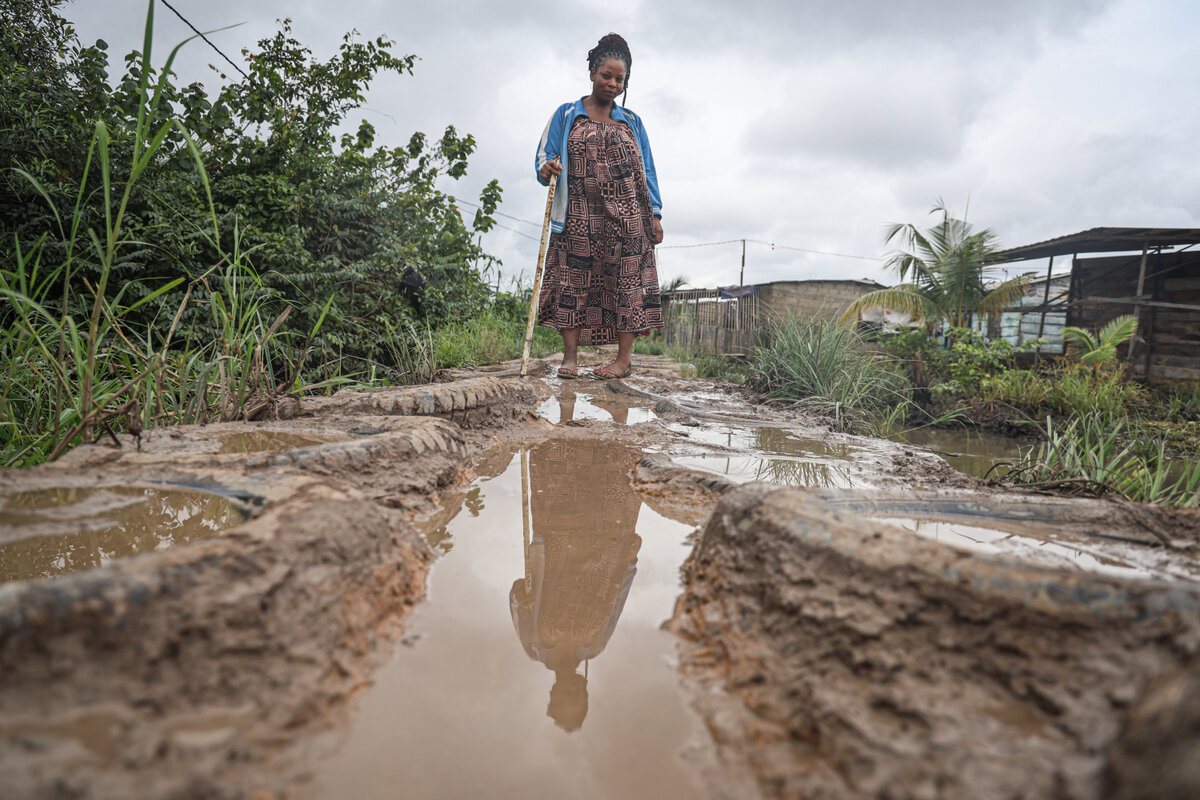 Kerin Ngwa und die Witwen von „Las Vegas“ müssen jetzt also selbst sehen, wie sie klarkommen. „Unser größtes Problem ist, dass wir zwar im Wasser leben, aber trotzdem kein Trinkwasser haben“, sagt sie und weist auf die versumpfte Fläche neben dem Weg. Zu sehen ist dort ein Holzverschlag – das Plumpsklo – das direkt in den Wassergraben führt. Mit dem verschmutzten Wasser sind Cholera und Malaria nicht loszuwerden.