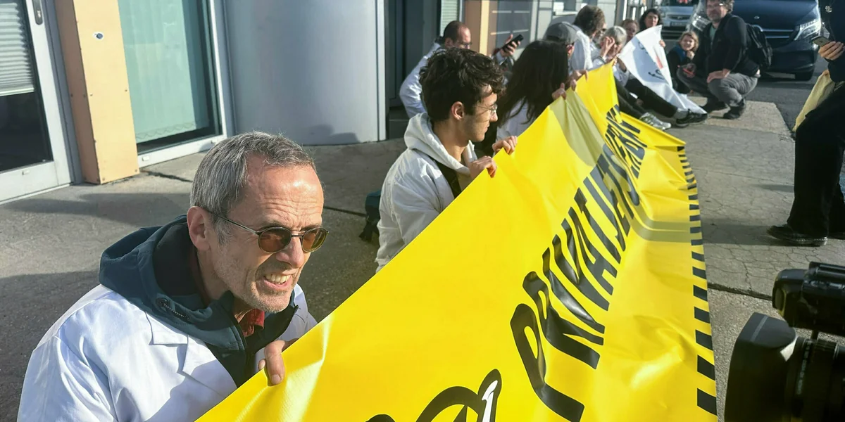 Auch Diskretion gehört gewöhnlicherweise zum Geschäft. Doch damit war es vorbei, als ein Dutzend Mitglieder der Klimaschutzgruppe Scientist Rebellion am Donnerstagvormittag den Eingang zum Terminal blockierten. Ihre zentrale Forderung präsentierten sie auf einem knallgelben Banner: „Privatjets verbieten“. Einer der Aktivsten ist der Bonner Geologie-Professor Nikolaus Froitzheim, der wie alle anderen Blockier:innen einen weißen Kittel übergestreift hat. In einer Ansprache durch ein Megafon bezeichnet er die private Luftfahrt als „Höhepunkt der Klimaungerechtigkeit und -zerstörung“.