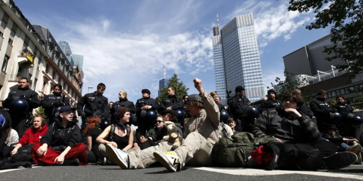 Der Protest: Globalisierungskritiker demonstrieren vom 16. bis 19. Mai in Frankfurt gegen die europäische Krisenpolitik, die Macht der Banken und für mehr Demokratie. Die Stadt hatte Demonstrationen verboten und Platzverbote gegen mehr als 400 Personen ausgesprochen. Erlaubt ist allein eine Veranstaltung, die am Samstag um 12 Uhr am Baseler Platz startet. Die Veranstalter rechnen mit einer Teilnehmerzahl „im fünfstelligen Bereich“. Bis Freitag hatten sich zwischen 1.000 und 3.000 Menschen beteiligt.