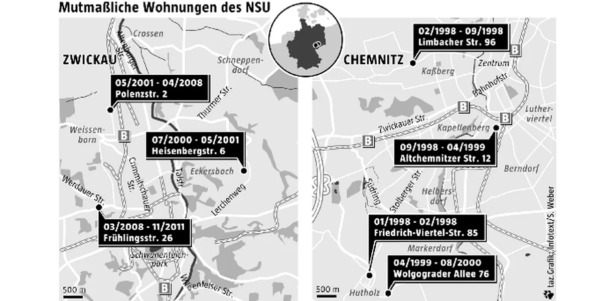 BERLIN taz | Das nach dem Kommunisten Heckert benannte Gebiet im Chemnitzer Südwesten muss Ende der 1990er so etwas wie ein sicherer Hafen für Rechtsextreme gewesen sein. Allein in der Friedrich-Viertel-Straße 85 sollen in einem halben Dutzend Wohnungen Neonazis gehaust haben.
