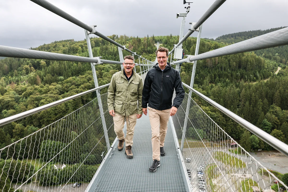 „Bildpunkt eins“ der von den beiden Staatskanzleien penibel orchestrierten Wanderung ist der Skywalk, die längste FußgängerInnen-Hängebrücke Deutschlands. Das filigrane Konstrukt, das an Stahlseilen hängt, 120 Tonnen schwer, überspannt die Schlucht, in der im Winter die Skispringer landen. Auf der hin- und herschwingenden Brücke, 100 Meter über dem Abgrund, trotzen die beiden Ministerpräsidenten Wind und Wetter, stellen sich geduldig in Pose, geben sogar Interviews: „Ein echtes Erlebnis“, schwärmt Rhein danach, „Wir sind sturmerprobt“, sagt lachend Amtskollege Wüst.