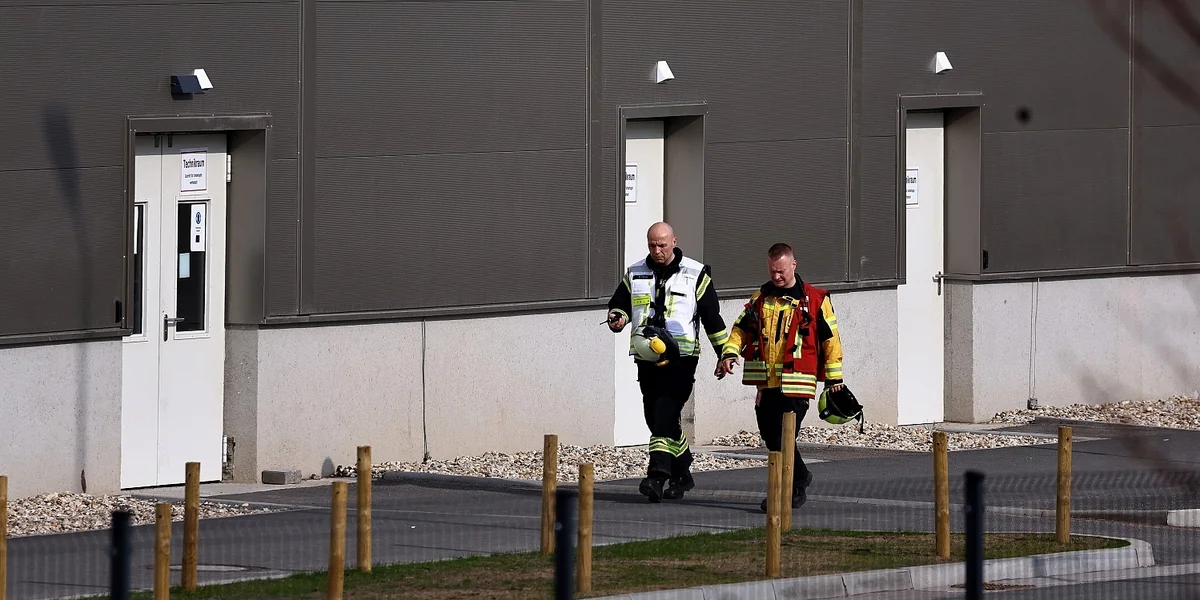 Nur noch Einsatzkräfte, keine Beschäftigten mehr vor Ort: die Teslafabrik in Grünheide nach dem Produktionsstopp Foto: Filip Singer/epa