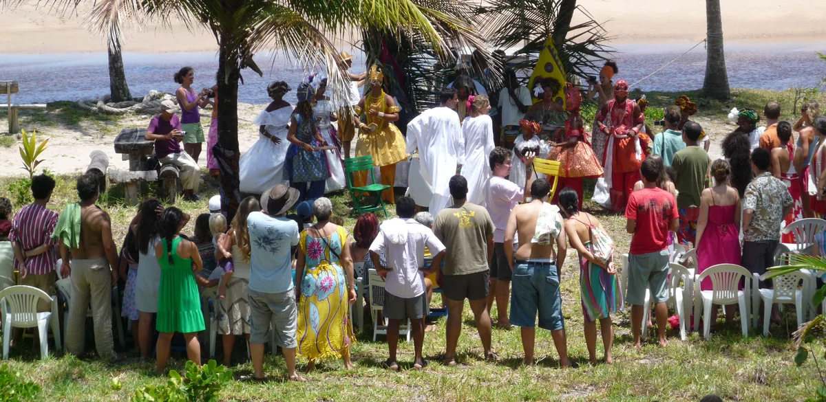 Am späten Nachmittag färbt die sinkende Sonne den Fluss golden. Zwischen Cashewbäumen sind auf einem Holzdeck Sitzkissen verteilt, zwei Mädchen verkaufen das halbgefrorene Mus aus der Acai-Palmfrucht und Vollwert-Schokoladenkuchen. Während es dämmert, füllt sich das Deck. Ein paar Kinder klettern auf den Tisch, die Erwachsenen unterhalten sich gedämpft, die Stimmung wirkt friedlich und entspannt. Nebenan beginnt in der Rundhütte ein Workshop zum Thema Aura-Reading.