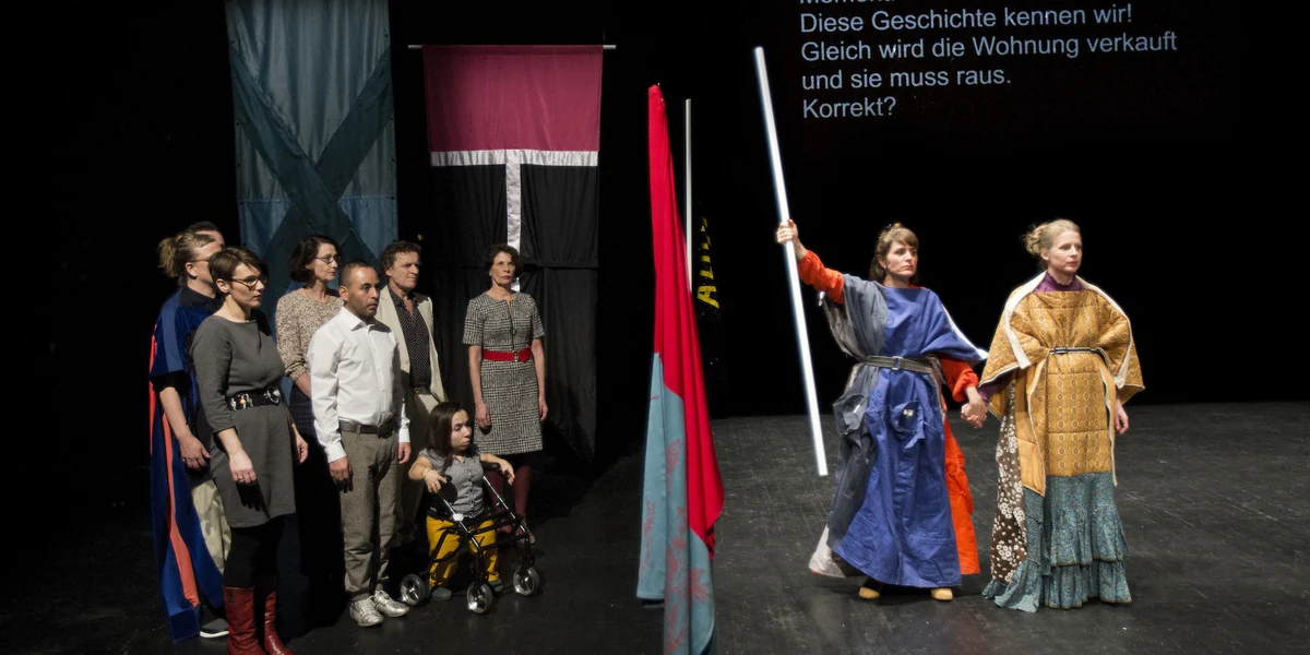Die Wohnungsknappheit und problematische Eigentumsverhältnisse greift das Theaterkollektiv She She Pop auf, in ihrem Stück „Oratorium“ im Gaswerk. Das passt: Der kathedralisch wirkende Saal wird ohne Tontechnik bespielt, lediglich eine traurige Solotrompete und ein munteres Xylofon füllen den Raum mit Klang. Und die wechselnden Sprechchöre. Wie von einem Teleprompter liest das Publikum nach Aufforderung in Gruppen seine Erwiderungen ab. Da sind mal Mütter ohne Altersvorsorge, mal Männer ohne Festanstellung angesprochen. Oder Erb*innen, die auf der Bühne ihr Erbe formulieren und die Summe errechnen sollen. Den etwa 15 Personen werden demnach über fünf Millionen Euro zuteil – den vielen auf den Sitzen wohl nichts.
