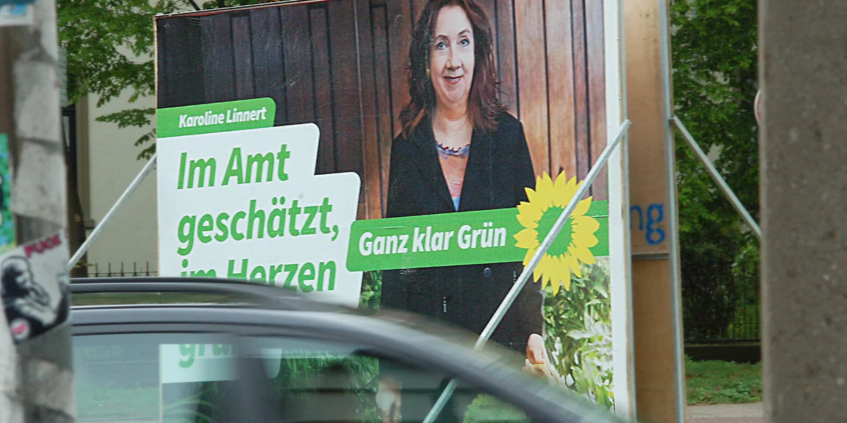 Dass sie im Herzen grün sei, behauptet das Großplakat von Karoline Linnert, und das soll, wie bei jeder gepflegten Allegorie, durch Accessoires kenntlich gemacht werden. Die taz schlüsselt sie auf: