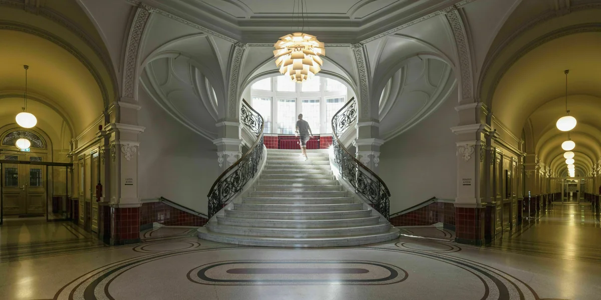 Die Börse feiert in diesem Jahr auch, dass ihr wuchtiger Repräsentativbau vor 120 Jahren eingeweiht wurde. Er verrät viel übers Selbstbild der Börsianer: innen eine avantgardistische Stahlkonstruktion mit radikal moderner Technik, also sieben Aufzügen, eigener Dampfmaschine für deren Betrieb und elektrischem Licht sowie Warmwasserheizung; eine zweckmäßige Lichtregie, die Fenster nach Norden und Nordwesten; nach außen eine reaktionäre Sandsteinfassade, deren neobarocker Schmuck blöderweise schon bald zu bröckeln beginnt.