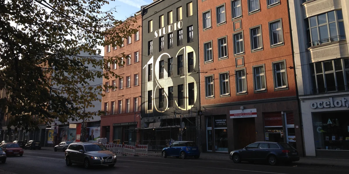 Diese Fassade ist ein Statement. In sechs bis sieben Meter hohen Lettern zieht sich die Hausnummer „183“ über zwei Etagen. In Gold. Auf schwarzem Grund. Gesetzt in der Schrifttype Roaring 20s, die von dem US-amerikanischen Designer Thomas Käding entworfen wurde. Von Fachleuten wird sie als Broadway-Style bezeichnet, mit Anlehnungen an Art déco. Oben drüber, etwas kleiner, ist noch das Wort „Studio“ zu lesen. Sind wir hier in New York?