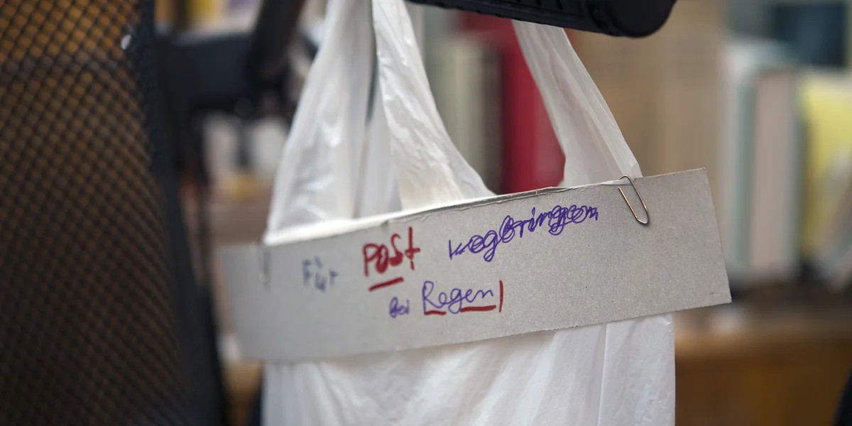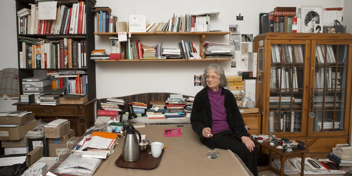 Drinnen: Eine Wortgewaltige lebt in dinggewaltigen Räumen. „Ich bin doch nicht gewaltig“, sagt sie. Überall Papierberge, Fotos, Notizen, Bücherstapel, Bücherwände, Bücherschränke, Kinderzeichnungen ihres Sohnes, Bilder, Erinnerungen, vergilbte Plakate, Plural, Plural, Koffer, ein Fahrrad, die Dielen rot wie Ochsenblut, geraucht wird auch. Alles, was gebraucht wird, um mit Worten umzugehen, gibt es im Überfluss.