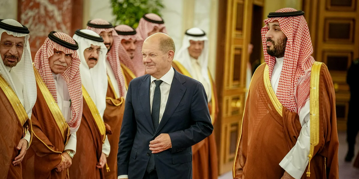 Der Kronprinz empfing den Kanzler im königlichen Palast des Friedens (Al-Salam-Palast) mit kräftigem Handschlag. Zu einem ersten Gespräch nahmen beide unter einem Porträt des Königs Salman Platz. Mit seinem Besuch setzt Scholz ein Zeichen der Normalisierung. Mit Frankreichs Präsident Emmanuel Macron, dem inzwischen zurückgetretenen britischen Premier Boris Johnson und US-Präsident Joe Biden waren vor ihm schon die wichtigsten Bündnispartner Deutschlands in Saudi-Arabien. Der Kronprinz war im Juli erstmals seit dem Mord auch wieder zu offiziellen Treffen in die EU gereist.