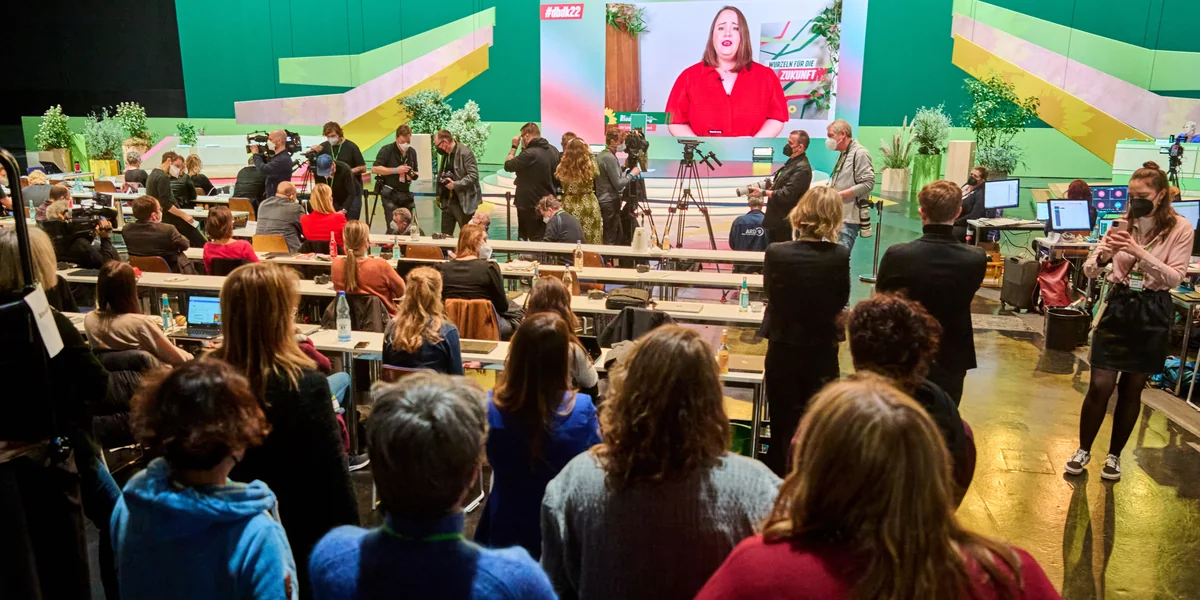Sie sitzt nicht mal in der Halle. Wegen einer Corona-Infektion nimmt sie von zuhause aus am Parteitag teil, den die Grünen im Berliner Velodrom abhalten und von dort an rund 800 Delegierte im Home Office ausstrahlen. Es sind eben seltsame Zeiten, in denen sich die Grünen fürs Regieren neu sortieren müssen.