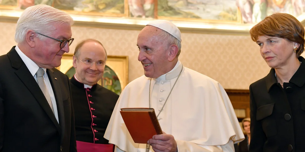 Es ist Montagmorgen Punkt zehn Uhr, als der Papst den Bundespräsidenten im Apostolischen Palast empfängt. Das vatikanische Protokoll hat dafür gesorgt, dass Frank-Walter Steinmeier und seine Ehefrau Elke Büdenbender zuvor durch die Räume der zweiten Etage zum Audienz-Saal geführt werden.