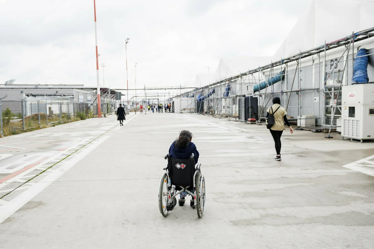 Die meisten Geflüchteten leben allerdings in weißen „Leichtbauhallen“ genannten Großzelten neben dem Gebäude. Je drei dieser „Hallen“ sind zusammengebaut, die mittlere hat einen durch Security überwachten Eingang und ist der Aufenthalts- und Essensbereich mit Infotresen, abschließbaren Spinden, Bierbänken und -tischen. Rechts und links schließt sich eine Schlafhalle mit je 360 Betten an, die mit dünnen, nicht bis zur Decke reichenden Pappwänden und Vorhängen in „Waben“ aufgeteilt sind.