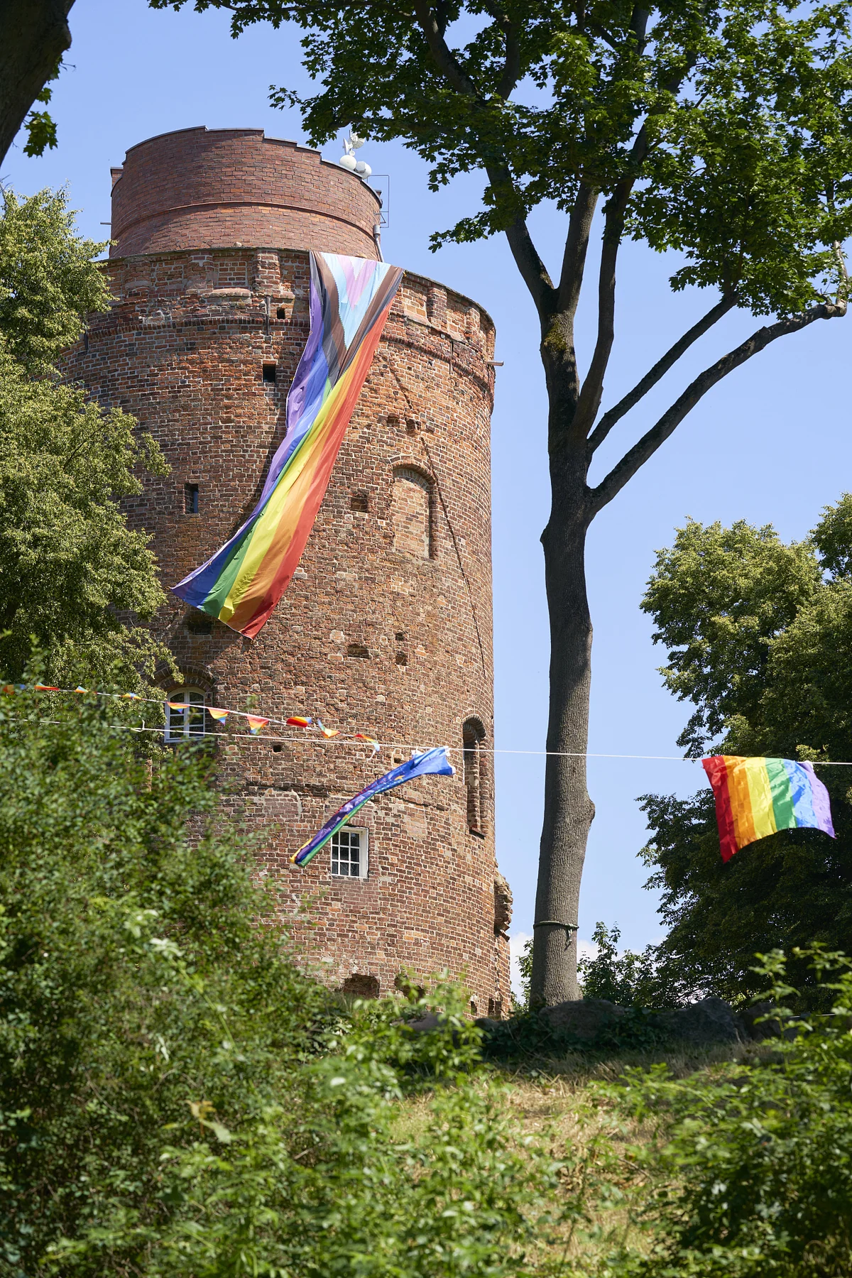 Nach dem Umzug setzt sich ein Grüppchen von fünf jungen Demonstrant:innen in den Schatten unterhalb des Lüchower Amtsturms, um sich kurz zu erholen. Der Deutsche Gewerkschaftsbund und Beratungsstellen haben hier ihre Stände aufgebaut. Sie kommen aus einem Dorf in der Lüneburger Heide, „Ultra-Pampa, ultra-konservativ“, wie sie sagen. Vor zwei Jahren waren sie schon einmal beim Lüchower CSD, der ihnen gefällt, weil er alternativer sei als der in Köln oder Hamburg. Mit einem queeren Treffpunkt haben sie in ihrem Dorf schon angefangen. Jetzt denken sie darüber nach, auch einen kleinen Land-CSD nach Lüchower Vorbild zu veranstalten.