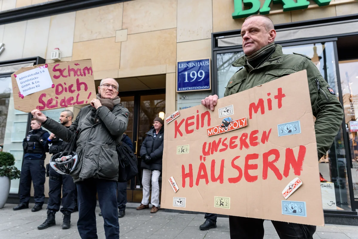 Am Kurfürstendamm 199 deutet auf den ersten Blick nichts auf den Vermieter hin. Nur der Name der Vermögensverwaltung steht dort auf einem Schild. Vor der Tür warten allerdings schon Polizist:innen, die den Eingang bewachen. Reinlassen wollen sie erst mal keinen. Der Geschäftsführer sei nicht da und die Angestellten wollten nicht aufmachen, lässt die Polizei mitteilen.