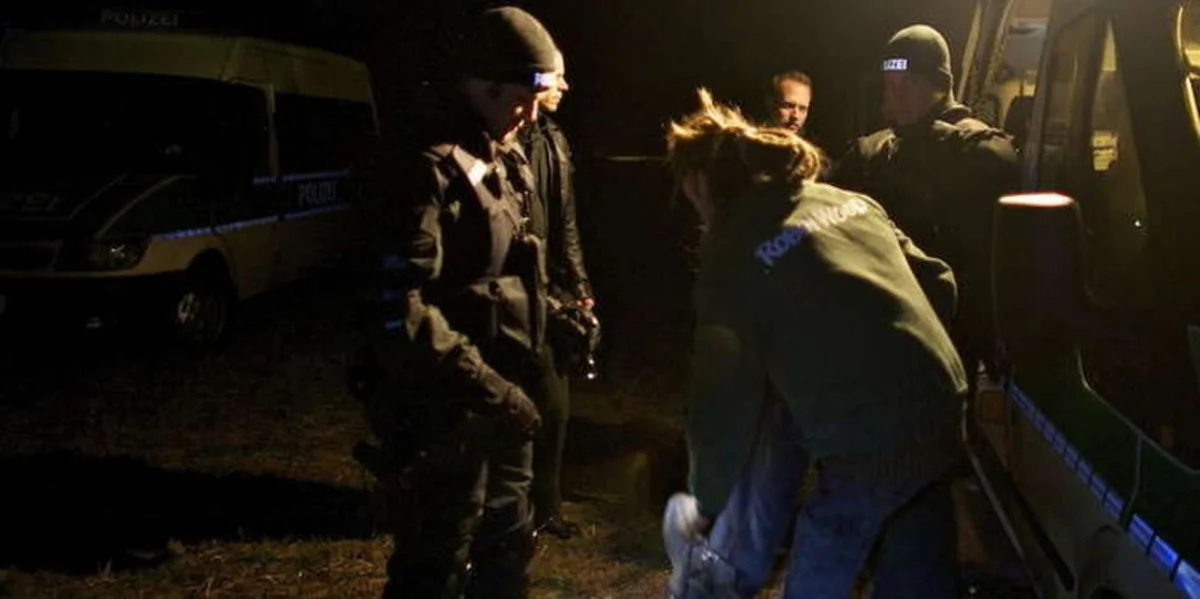 Bei Gusborn. Die südliche Strecke ist nur noch für Anwohner passierbar. Die Signalwesten der Polizisten, die Patroullie laufen und die Büsche kontrollieren, leuchten im Licht der Autoscheinwerfer. Bei einer Polizeikontrolle weisen die Beamten darauf hin, dass es auf der Straße zwischen Dannenberg und Grippel eine Blockade gäbe und die Durchfahrt auch für Journalisten nicht möglich sei. Wie sich kurz darauf zeigt, stimmt das nicht.