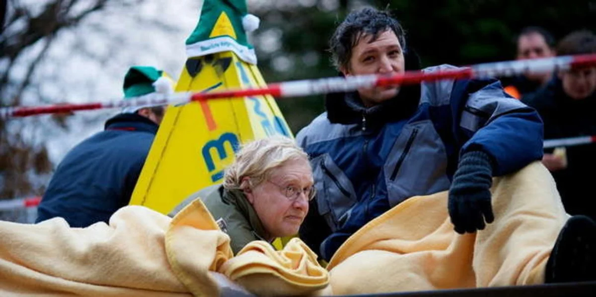 Harlingen. Mitten in der Blockade. Zwei Robin-Wood-Aktivisten haben sich an den Gleisen angekettet. Etwa auf gleicher Höhe hängt eine Kletterin und ein Kletterer in den Bäumen. Wahrscheinlich auch Robin-Wood-Aktivisten. Notärzte sind inzwischen eingetroffen und schützen die Angeketteten gegen die Kälte.