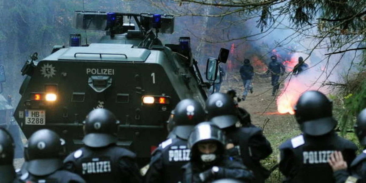 Harlingen. Ein Polizeisprecher fordert die Blockierer erneut auf, freiwillig zu gehen. Dann hätten sie freies Geleit, ansonsten drohe der "Feldgewahrsam“. Was das bedeuten kann, wissen die Blockierer vom vergangenen Jahr: Gefangenensammelstelle im Freien, stundenlang eingekesselt von Polizeifahrzeugen, die Stoßstange an Stoßstange stehen. Vom Lautsprecherwagen der Demonstranten schallt Tone, Steine, Scherben.