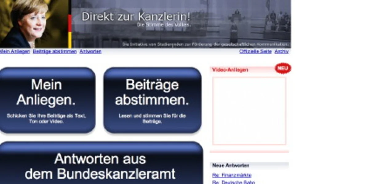 Aus "Direktzurkanzlerin.de" hat sich inzwischen längst ein kleines Frage-und-Antwort-Imperium entwickelt. Die Macher konnten auch die Ministerriege in Brandenburg dazu bewegen, an der Plattform teilzunehmen - seit Anfang November sind über "direktzu.de" auch Landeschef Matthias Platzeck, Innenminister Jörg Schönbohm, Umweltminister Dietmar Woidke, Justizministerin Beate Blechinger und Bildungsminister Holger Rupprecht ansprechbar.