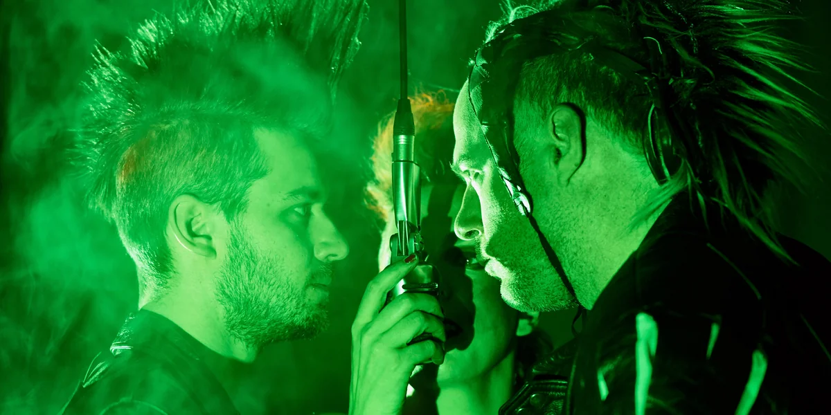 Drei Tribünen sind um ein Dreieckspodium arrangiert. Ein Schlagzeuger poltert Rock-Patterns und grölt dazu im veralbernden Tonfall Phrasen wie „Scheiß auf das System“, „Bier her“ oder „Schlagt die Bullen tot“; dazu schnaubt Höllennebel aus dem Untergrund. Wenn ein Schauspieler anhebt, weitere Rechercheergebnisse darzubieten, wird dazwischen gehauen, trommelnd oder auch mal rülpsend. Manchmal übernimmt dies auch ein Fakten spuckender Sidekick mit spontanen Lachanfällen und gezielten Schmatzattacken. Das soll der Punk-Geist sein, mit dem – manchmal aus sozialer Not geborenen – Narzissmus des Andersseins sich verweigernd, die Ordnung störend, auch die eines wohlfeilen Dokumentartheaterabends.