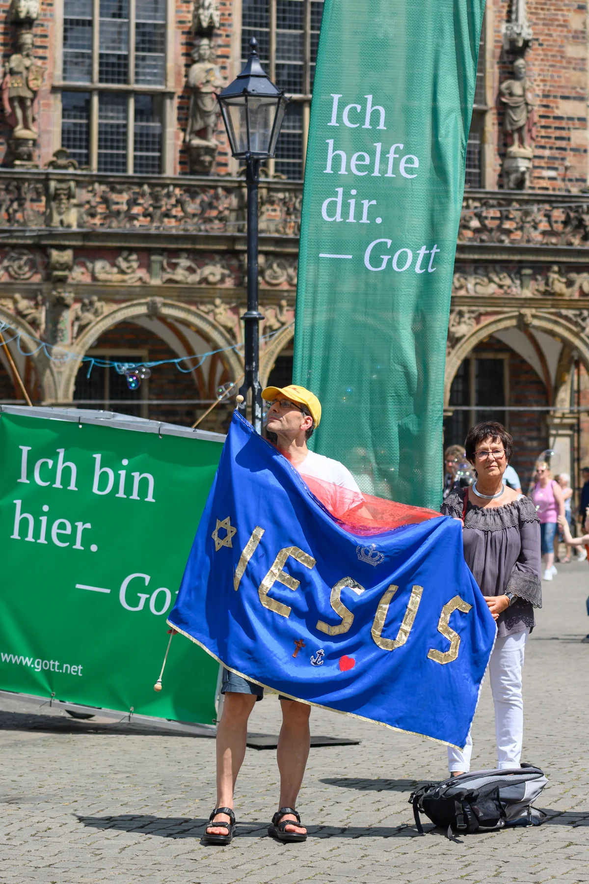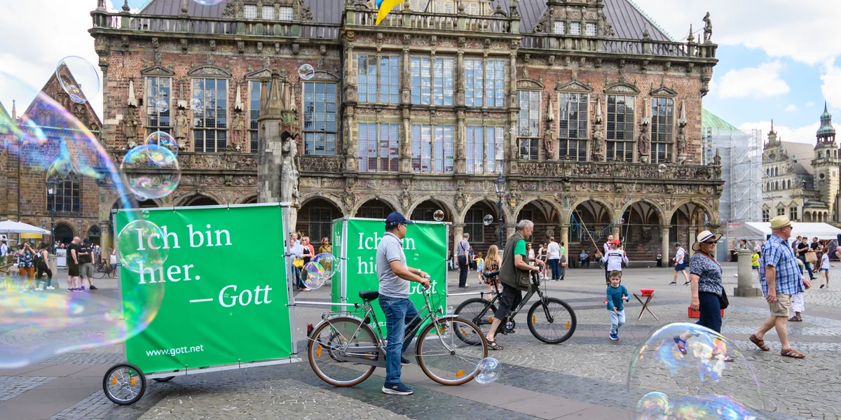 E in sonniger Samstag Ende Juni auf dem Bremer Marktplatz, gesäumt von historischen Gebäuden: Rathaus, Dom und Schütting, Sitz der Bremer Kaufmannschaft. Dazwischen befinden sich Cafés, auf ihren Terrassen sind alle Sitzplätze belegt, in der Mitte des Platzes macht ein Mann gigantische Seifenblasen, um ihn herum rennen Kinder, ein Brautpaar lässt sich vor dem Schütting fotografieren. Mitten durch den Trubel fahren langsam vier Fahrräder. Sie ziehen etwa zwei mal zwei Meter große Plakate auf Rollen hinter sich her. Darauf stehen die Slogans „Ich glaub an dich“, „Ich bin hier“ oder einfach nur „Moin“. Unterschrieben ist jedes Zitat mit „Gott“.