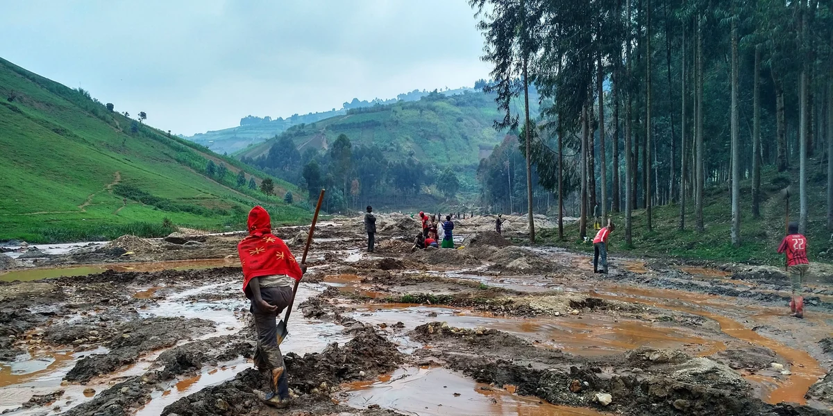 Knallblaue Gummistiefel, hochgekrempelte Jeans und gefütterte Regenjacke: So steht Richard Bisingimana knietief im Matsch. Der 24-jährige Bergmann gräbt mit bloßen Händen einen Kanal in das Flussbett und legt Steine an den Rand. „So waschen wir die Mineralien aus“, sagt er und greift nach einer Schaufel. Damit schiebt er die matschigen Ablagerungen aus dem Fluss in den Kanal. Rostbraunes Wasser fließt zwischen den Steinen ab, übrig bleibt ein Gemisch aus Kieseln. Bisingimana greift hinein und zeigt auf ein paar glitzernde Steinchen in seiner Handfläche. Er grinst. „Hier, das ist Coltan“, sagt er und lacht. „Davon bezahle ich die Schulgebühren für meine Kinder.“
