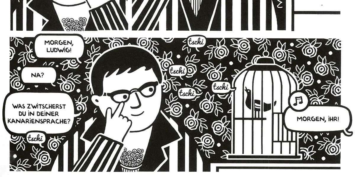Ich wollte durch Wiederholungen und Transpositionen von Motiven eine visuelle Sprache entwickeln, die zu dieser Erzählung passt. Meine große Frage war: Wie zeichnet man Musik? Wie bekommt man es hin, dass Zeichnungen den Wechsel der Musik und der Klänge ausdrücken, etwa wenn Abdallah in Wien ist, um dem Klavierbauer Hofman seine Erfindung vorzustellen.