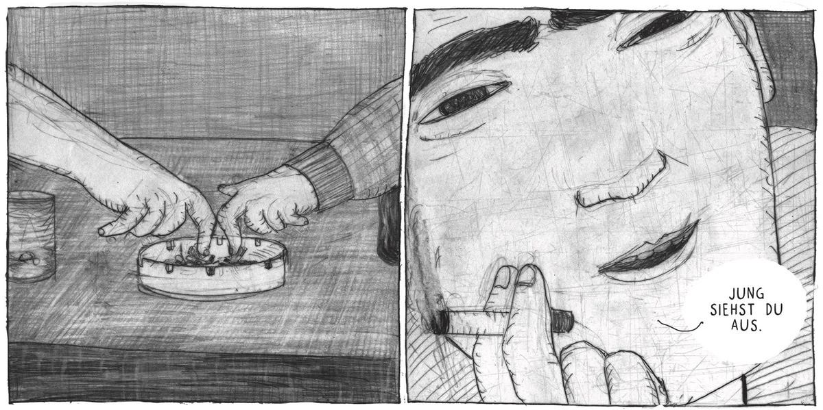 Bagatellen sind das alles, sicherlich. Aber wie in Short Storys blitzt im Alltäglichen das große Ganze auf, in zugleich individueller wie allgemeiner Hinsicht. Im Gegensatz zu den leuchtenden Farben in „Diebe und Laien“ ist dieser Comic in einem Schwarz-Weiß gehalten, in dem die Grautöne dominieren. Noch mehr als zuvor konzentriert sich Suess auf die Darstellung von Gesichtern, die immer wieder, wie in einer Großaufnahme, ganze Panels ausfüllen. Auch ohne Worte und über die Worte hinaus lassen sie erkennen, was in den Figuren vorgeht. Die Gesichter sind in „Drei oder vier Bagatellen“ der eigentliche Schauplatz der Handlung.
