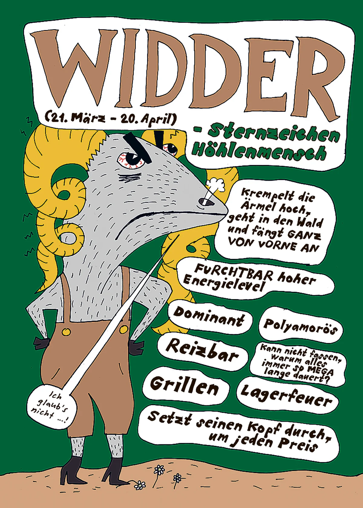 Strömquist nimmt sich berühmte Beispiele vor, etwa den lüsternen Skorpion King Charles („Ich will dein Tampon sein“) oder den hartnäckigen Widder Jane Goodall, der sich 32 Jahre lang einer Schimpansen-Horde aufdrängt. Oder Beyoncé, die den Typus der langweiligen und perfektionistischen Jungfrau verkörpert.