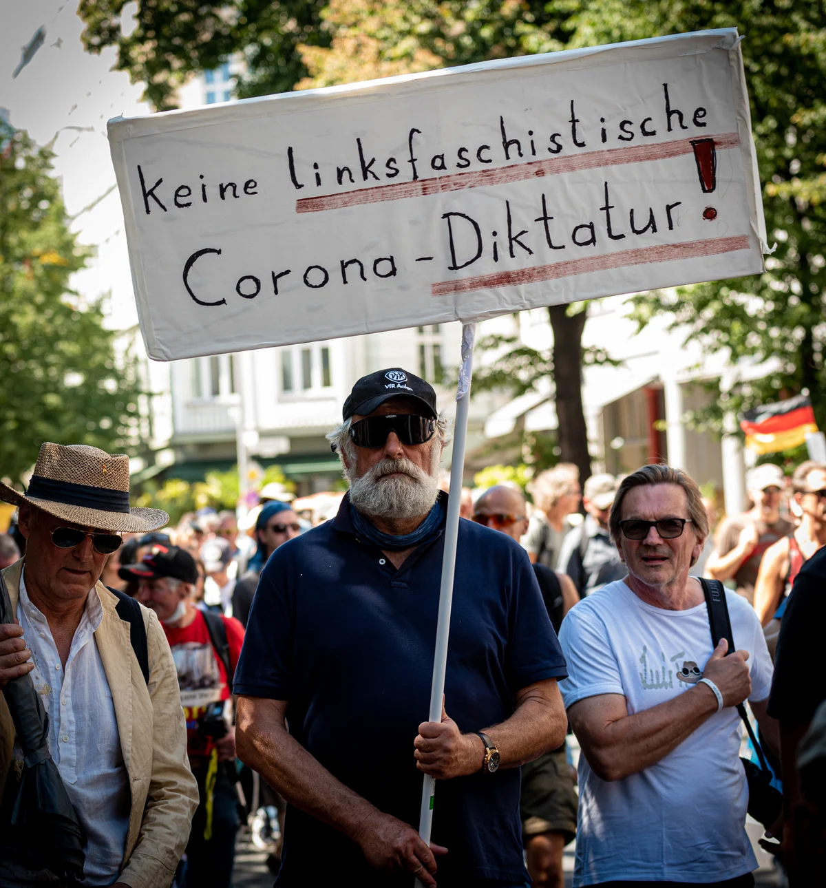 Auf anderen Schildern wird gewarnt vor Zwangsimpfungen, Bill Gates und tödlicher 5G-Strahlung. Häufig zu sehen ist der Buchstabe „Q“ – eine Referenz auf Qanon, eine Onlinebewegung, die besonders obskure Verschwörungstheorien verbreitet. Angehörige der Reichsbürger-Szene stehen in der Sonne. An mehreren Stellen der Demo ragen ihre schwarz-weiß-roten Reichsflaggen in die Höhe. Den Kämpfern gegen die angeblich drohende Impfpflicht ist offenbar nicht bewusst, dass ebenjenes Kaiserreich am 8. April 1874 zum ersten Mal eine Impfpflicht eingeführt hatte – und die Polizei diese bis in die Weimarer Republik durchsetzte und Kinder zur Not mit Gewalt zum Arzt brachte.