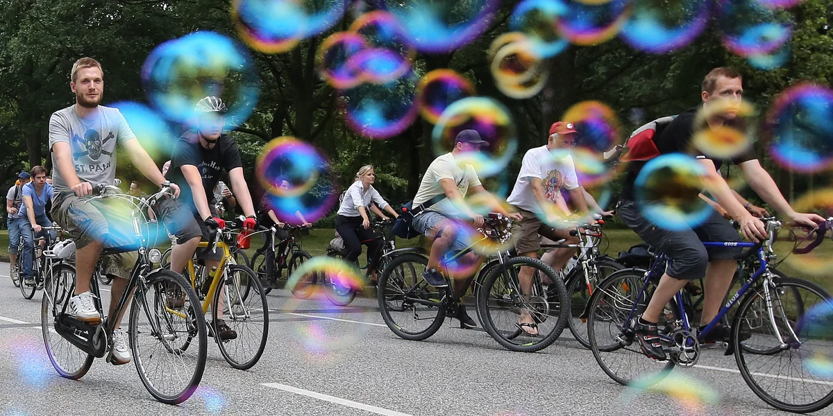 Aus verschiedenen Ecken kommt unterschiedliche Musik, ein paar Leute haben Boxen auf Lastenrädern oder in Anhängern mitgebracht. Irgendwann beginnen ein paar Radfahrer zu klingeln, immer mehr steigen ein, klingeln auch. Der Pulk kommt langsam in Fahrt, setzt sich in Richtung Innenstadt in Bewegung.