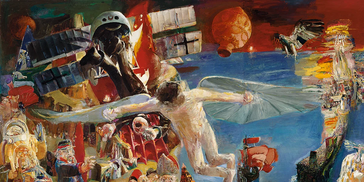 Wie auf der politischen Landkarte jener Zeit herrscht das Böse im Westen, also links, während das Glück des Kommunismus im Osten, also in der Sowjetunion, dämmert. Die in der Bildmitte aufeinanderprallenden gegensätzlichen Weltentwürfe stehen für das Alte und das Neue, für Imperialismus und Kommunismus. An dieser Schnittstelle befand sich einst die kleine DDR, dort standen die hoch dotierten Maler an ihren Staffeleien. Sie waren nicht mehr jung und brauchten das Geld.