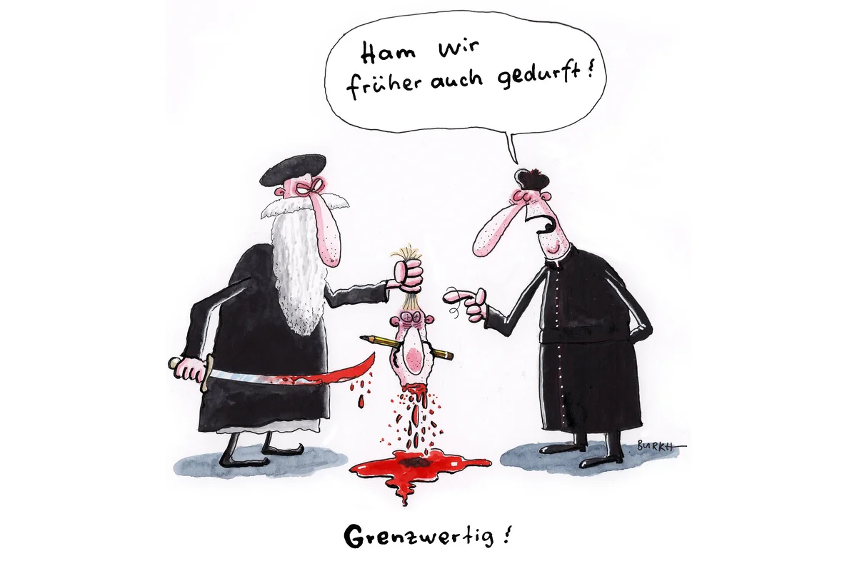 Abgestoßen reagierten viele auf eine Karikatur von Charlie-Zeichnerin Coco, die Libération abdruckte und die einen Jungen im Gazastreifen zeigt, der ausgehungert eine Ratte jagt, aber – es ist Ramadan – von seiner Mutter ermahnt wird, damit bis zum Sonnenuntergang zu warten. Coco erhielt daraufhin Morddrohungen, Charlie stellte sich an ihre Seite, und ganz Paris diskutierte wieder über das, was man sagen, was man zeichnen kann. Eigentlich ist ja alles wie immer. Hart an der Grenze des guten Geschmacks und mitunter auch darunter. Darf man das? Ja. Muss man das gut finden? Nein.