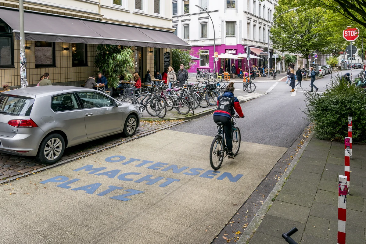 Der Stadtteil Ottensen im Bezirk Altona ist ein Ort, an dem sich Konflikte um den Straßenraum buchstäblich verdichten. Ottensen war in der Mitte des 19. Jahrhunderts noch ein Dorf. In unmittelbarer Nachbarschaft zu der holsteinischen Stadt Altona entstanden im Zuge der Industrialisierung: Glashütten, Schiffschrauben- und Kranfabriken. Das geschah ungeplant, sodass ein Viertel mit engen verwinkelten Straßen entstand, in dem Gründerzeithäuser direkt neben Fabriken hochgezogen wurden. Heute ist das charmant, weil es überall in den Straßen kleine Geschäfte, Cafés und Kneipen gibt.
