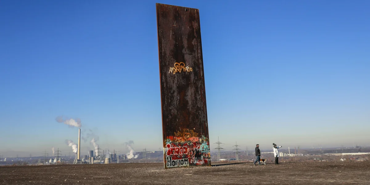 Ein paar Radkilometer weiter strampeln wir hoch zur Skulptur „Bramme für das Ruhrgebiet“ von Richard Serra. Die rostpatinierte Stahlplatte auf der Schurenbachhalde in Essen, 15 Meter hoch und nur 10 Zentimeter dick, bespielt als Solitär eindrucksvoll das vegetationslose Plateau. Schnörkellos, wuchtig, klare Kante. Für den Kulturjournalisten Andreas Rossmann symbolisiert die Bramme, „scheinbar einsinkend“, das Verschwinden der Montanindustrie. „Allein übrig geblieben“ stecke die Bramme „in Beckett’scher Einöde.“ Nicht einmal ein Bäumchen wie bei Godot bietet Schatten bei dieser gottverdammten Hitze. Während am Haldenfuß die A 42 in Endlosschleife rauscht, zeugen nur ein paar sonnengedörrte Pferdeäpfel vom Brammen-Besuch.