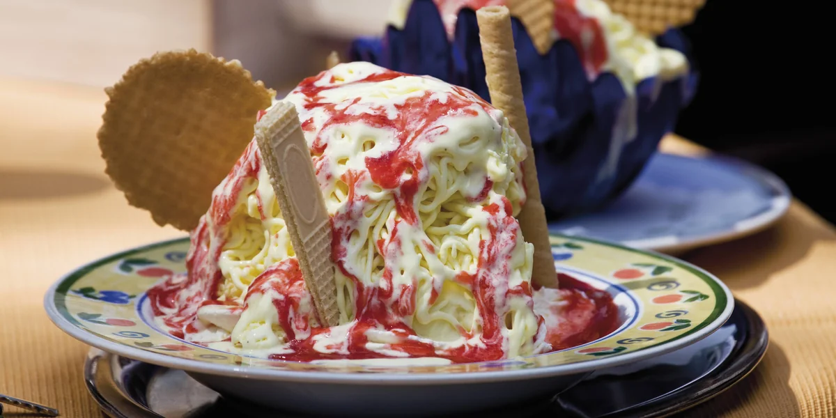 Dass das Spaghetti-Eis aus Deutschland stammt, eignete sich bis vor Kurzem nur für die Nummer 654 auf der Liste des unnützen Wissens. Doch so banal ist die Sache nicht. Die Kaltpasta ist zugleich ein sehr hiesiges Gericht geblieben. Eine fein schmelzende süße Mischung, von außen betrachtet aber ein original italienisches Nudelgericht – es gibt kaum ein Land, wo sich solch eine Verkleidung mit der Esskultur vertrüge. Nehmen wir als Beispiel nur Österreich, das mit den Mehlspeisen eine eigene Kategorie süßer Hauptgerichte entwickelt hat. Ein Eis als salziges Pastagericht zu maskieren, gälte hier vermutlich nur als skurril.
