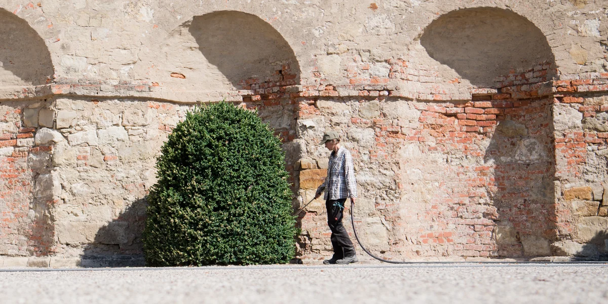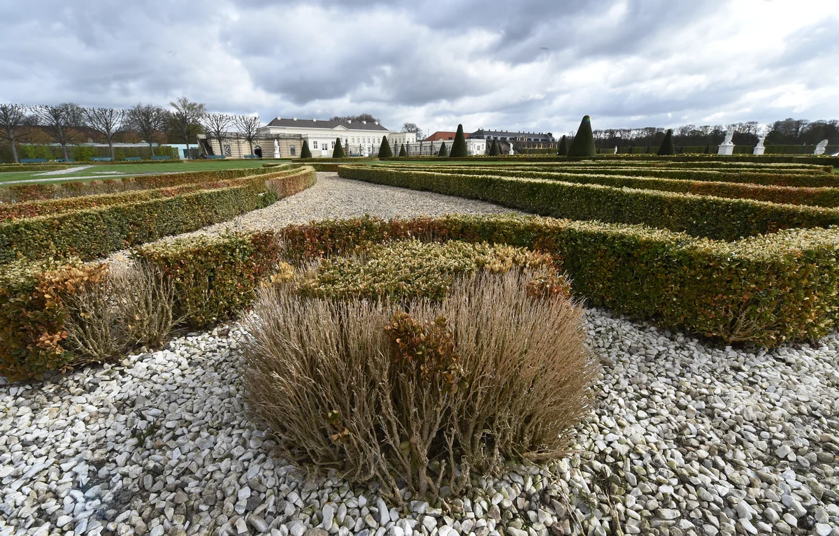 „Das sieht nach Pilz aus“, sagt Thomas Amelung und zeigt auf ein paar Meter grauer Zweiggerippe im Großen Parterre – in Barockgärten die Bezeichnung für die terrassenartigen Beete in unmittelbarer Nähe des Schlosses. Amelung ist der Gartenmeister des Großen Gartens, wie Schlumpberger Angestellter der Stadt, denn die Gärten – auch das eine Besonderheit – sind in kommunalem Besitz. An einem windigen, nasskalten Tag Anfang April führen die beiden über geharkte Kieswege durch den Park. Nicht überall ist der Schaden so deutlich zu sehen, aber es gibt immer wieder kahle Stellen oder solche, wo das Laub der Büsche braungrau verfärbt ist.