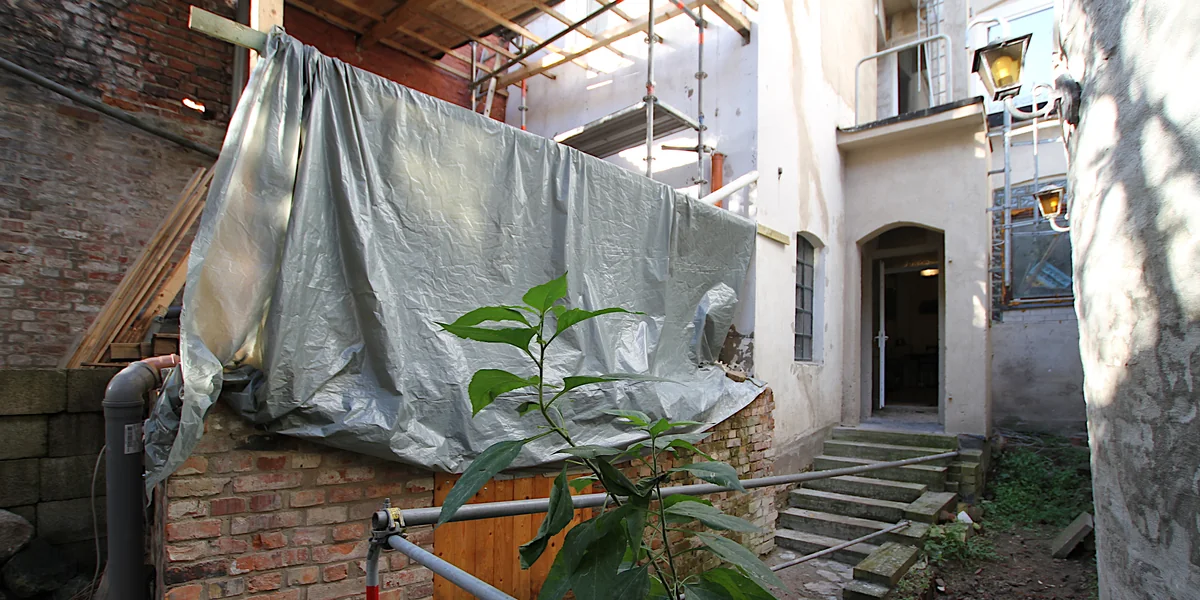 Nun gehen wir durch diesen Nachteingang, vorsichtig, denn es ist früh dunkel und der Untergrund ist tückisch. Wir balancieren vorbei an Geröllbergen, dann auf Spanplatten durch einen Hausflur. Offene Wunden klaffen im Mauerwerk. Am Ende führt eine löchrige Baustellentür auf eine Seitenstraße.