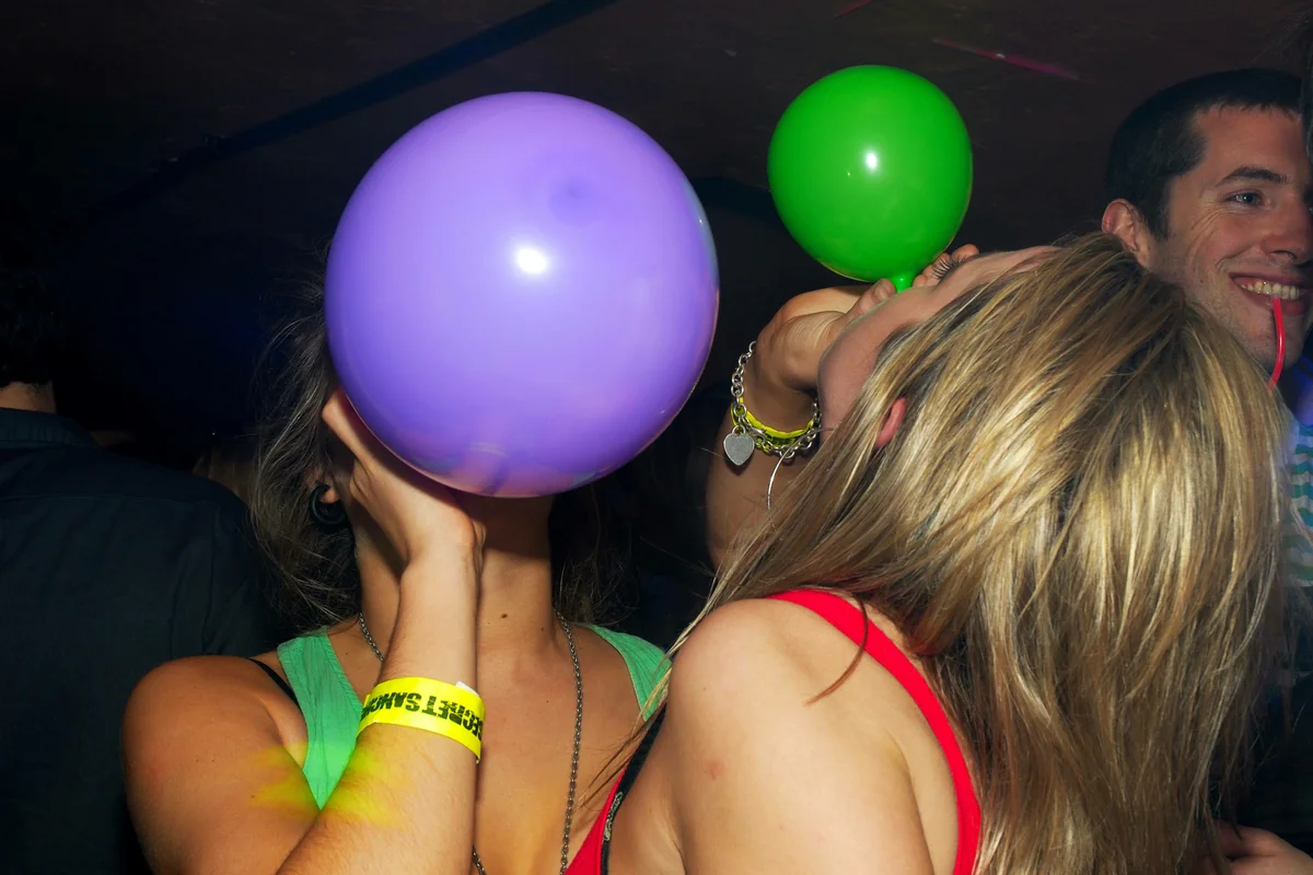 Über einen Aufsatz wird das Lachgas in einen Ballon gefüllt und dann mehrfach ein- und ausgeatmet. Der kurze Flash ist zunächst so harmlos wie der Name: Die Wahrnehmung verändert sich, nach wenigen Sekunden setzt ein Kribbeln und Flimmern ein, es kommt zu temporären Sprachstörungen, leichten Halluzinationen und Kicheranfällen. Manche User*innen fallen um oder treten komplett weg. Nach etwa einer Minute ist alles vorbei. Die häufigsten Nebenwirkungen sind laut einer Studie Kopfschmerzen, Schwindel und Kribbeln in den Armen.