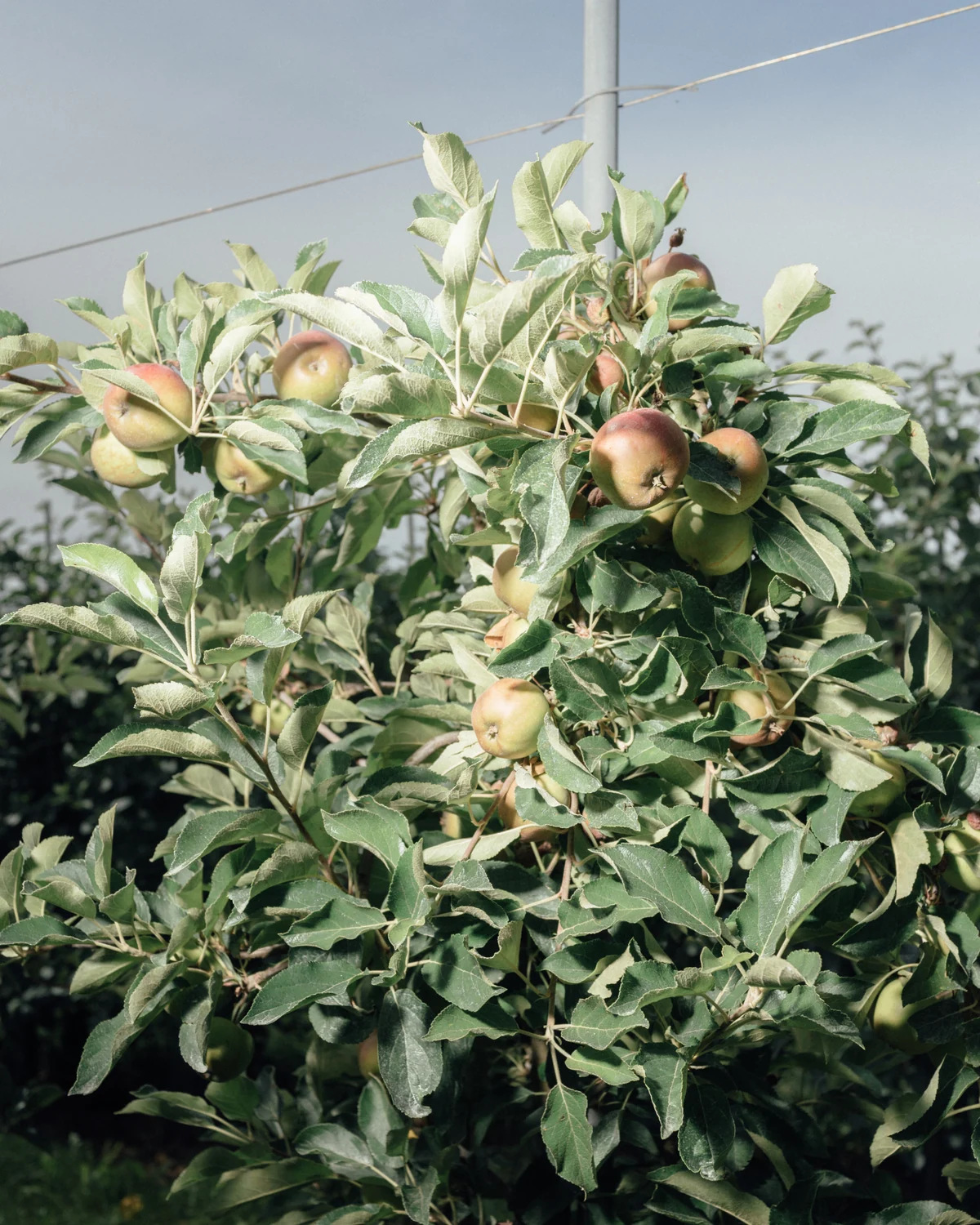 Gerade sind keine Saisonarbeitskräfte auf dem Hof, die Auskunft geben könnten. Sie würden erst zur Apfelernte im September und Oktober kommen, sagt Wollanik. Aber man kann sich die Plantage anschauen, auf der sie arbeiten. In langen Reihen stehen Apfelbäume dort an einem Gerüst aus Metallstangen, zwischen denen zwei Drähte gespannt sind. Am unteren hängt ein schwarzer Kunststoffschlauch, aus dem Wasser für die Pflanzen auf den Boden tropft. Äpfel hängen etwa ein bis zweieinhalb Meter hoch. Zum Ernten müssen die Arbeiter jede Frucht berühren. Es gibt bisher keine serienreife Maschine, die Äpfel für den Verzehr als Tafelobst ernten könnte. Deshalb ist die Produktion so teuer.