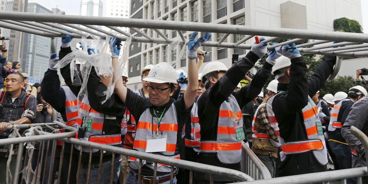 Freie Fahrt statt freie Rede: Arbeiter bauen die Sperren im Zentrum Hongkongs ab. Bild: reuters