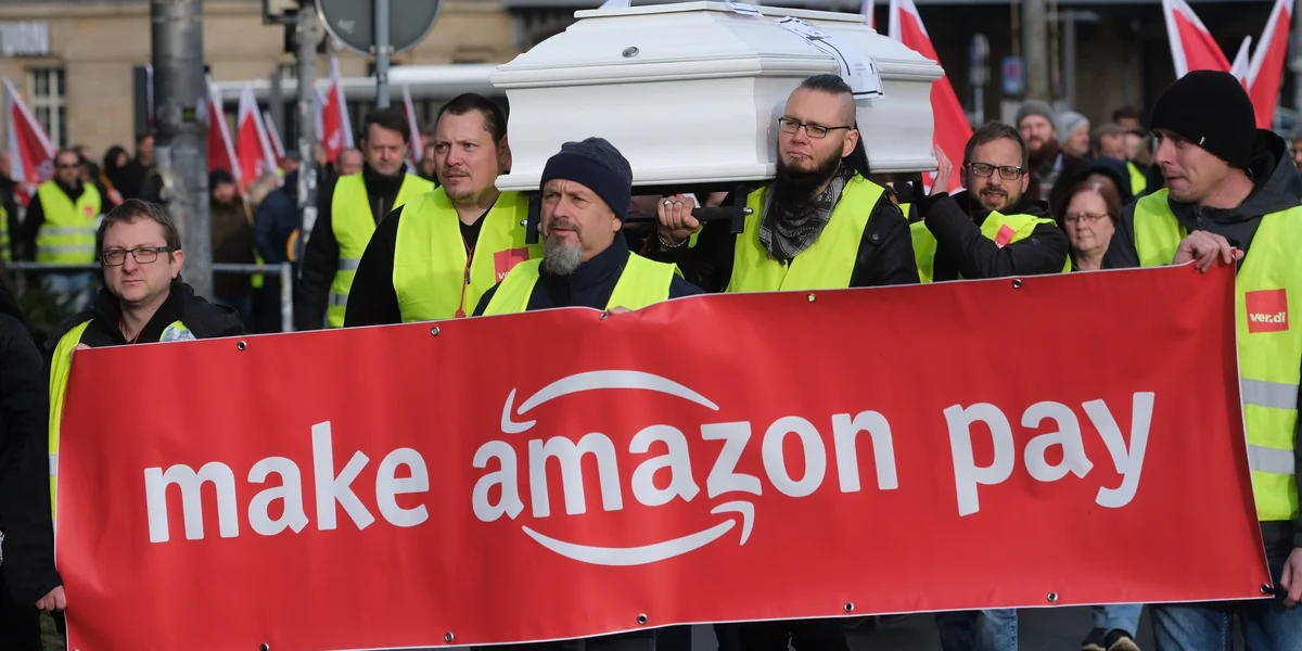 Für seine Selbsterhebung wurde Amazon am diesjährigen Black Friday weltweit bestraft. Im Rahmen der “Make Amazon Pay“-Kampagne traten in über 30 Ländern Amazon-Beschäftigte und Aktivist*innen in den Streik. Es sind so viele, wie noch nie zuvor. „Zahlen“ – also zur Verantwortung gezogen werden – soll der Konzern für seine unmenschlichen Arbeitsbedingungen, schamlosen Steuervermeidungspraktiken und dem auf Überkonsum und gigantischen CO2-Emissionen basierenden Geschäftsmodell.