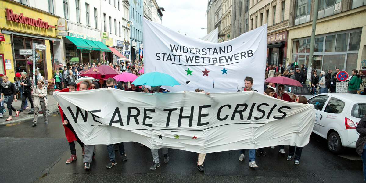 Für das Blockupy-Bündnis, das sich bisher auf Proteste gegen die Europäische Zentralbank in Frankfurt am Main fokussierte, war die Demonstration unterdessen der „erste Schritt nach Berlin“, wie Wilken sagte. Tatsächlich erinnerte der vordere Teil der Demo mit vielen bunten Regenschirmen an Bilder, wie man sie bereits aus Frankfurt kennt.