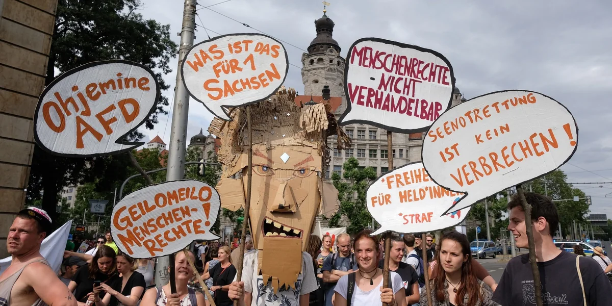 Auch die Studentin Sarah ist bei der Demo dabei. Sie ist Teil von „Wann, wenn nicht jetzt“, einem Zusammenschluss von Jugend- und Kulturorganisationen im ländlichen Raum. Die Vereinigung organisiert diesen Sommer eine Konzert- und Lesetour durch ostdeutsche Dörfer. Teil davon ist auch das „Dorf der Jugend“ in Grimma, dem die AfD im Leipziger Kreistag zuletzt öffentlich mit gezielten Kürzungen gedroht hat. „Die Ergebnisse der Kommunalwahlen waren für viele von uns zwar nicht überraschend, aber trotzdem schockierend“, sagt sie. „Wir kämpfen Tag für Tag unter deutlich erschwerten Bedingungen, und die Angriffe von rechts auf unsere wenigen Freiräume nehmen immer weiter zu.“