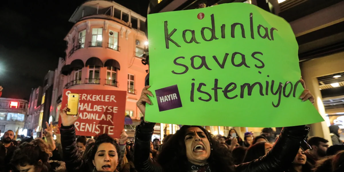 Bei dem Protest in Kadıköy skandieren die Menschen: “Wir werden deine Präsidentschaft nicht zulassen“. Unter ihnen trägt eine Frau ein Transparent mit der Aufschrift „Frauen wollen keinen Krieg“, eine andere begleitet den Protest mit einem „zılgıt“ (Dabei handelt es sich um einen lauten Ausruf, der vor allem in der kurdischen Kultur sowohl bei festen, als auch bei Protesten zur Anwendung kommt. Anm.d.Red.).