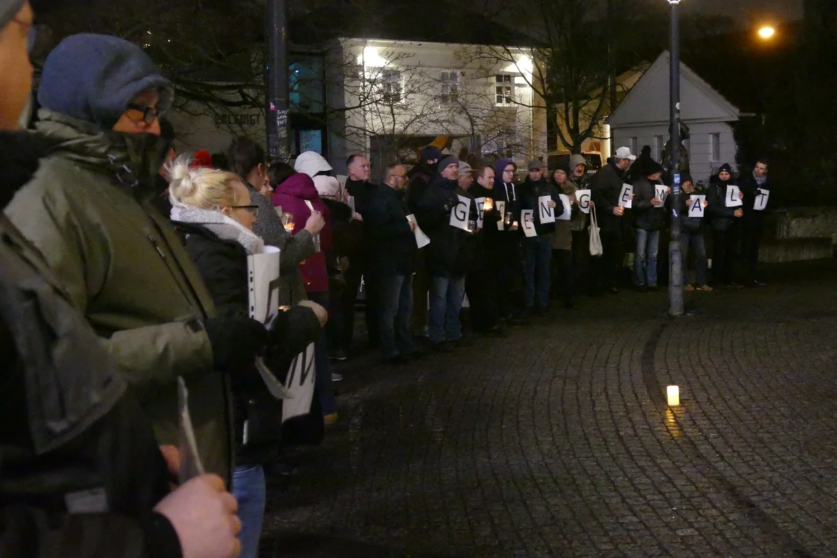 Um 19 Uhr stellen sich die Mahnwachen-Teilnehmer*innen im Halbkreis um eine Kerze. Sie halten je ein DIN A 4 Blatt mit einem darauf gedruckten Großbuchstaben hoch. „Demokraten gegen Gewalt“ ist so zu lesen. 21 Buchstaben – es kommt gerade hin.