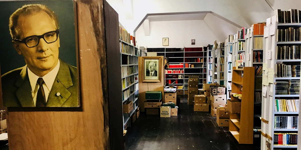 Die Lagerhalle: In einem Industriegebiet, zehn Autominuten von Staucha, hat Peter Sodann eine Halle auf einem verlassenen Militärareal angemietet. Ein wüster Ort. Hier wird das Motto der Sodann-Bibliothek wahr: „Das Wissen des Ostens in den Bananenkisten des Westens“. So weit man blickt: Bananenkisten voller Bücher. Alles verpackt in Folie. In einem kleineren Raum stehen Kisten mit Schallplatten aus der DDR. Auch sie will Sodann nicht wegwerfen. „Es gab doch alles in der DDR“ sagt er.