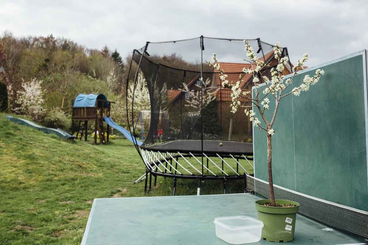 Draußen: Direkt an der ehemaligen innerdeutschen Grenze, nicht weit von Helmstedt, liegt der kleine niedersächsische Ort Grasleben. Familie Thieme-Hohe wohnt in einer Siedlung etwas abseits der Hauptstraße, in einem großen, weißen Haus mit weitem Garten. Die Garage ist offen, darin ein schwarzer Minivan und Kinderfahrräder. Ein gepflasterter Weg führt zur Haustür.