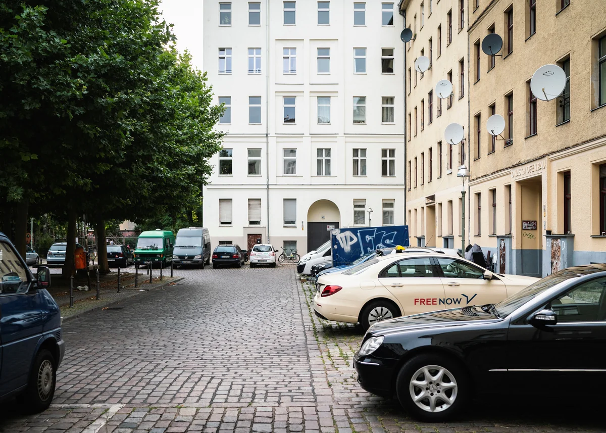 Draußen: Ruhig ist es vor dem Haus in Berlin Kreuzberg. Eben noch U-Bahn- und Verkehrsrauschen, geschäftige Obststände und Dönerläden, Menschen, die auf der Straße vor Kiosken sitzen. Und jetzt zwölf ausladende Ahorn-Bäume, pedantisch im Kreis angeordnet. Außenherum parken Autos am Kopfsteinpflasterstraßenrand und ein paar Fahrräder. Die Baumkronen spenden Schatten, wenn man sich auf eine der acht Bänke setzt.